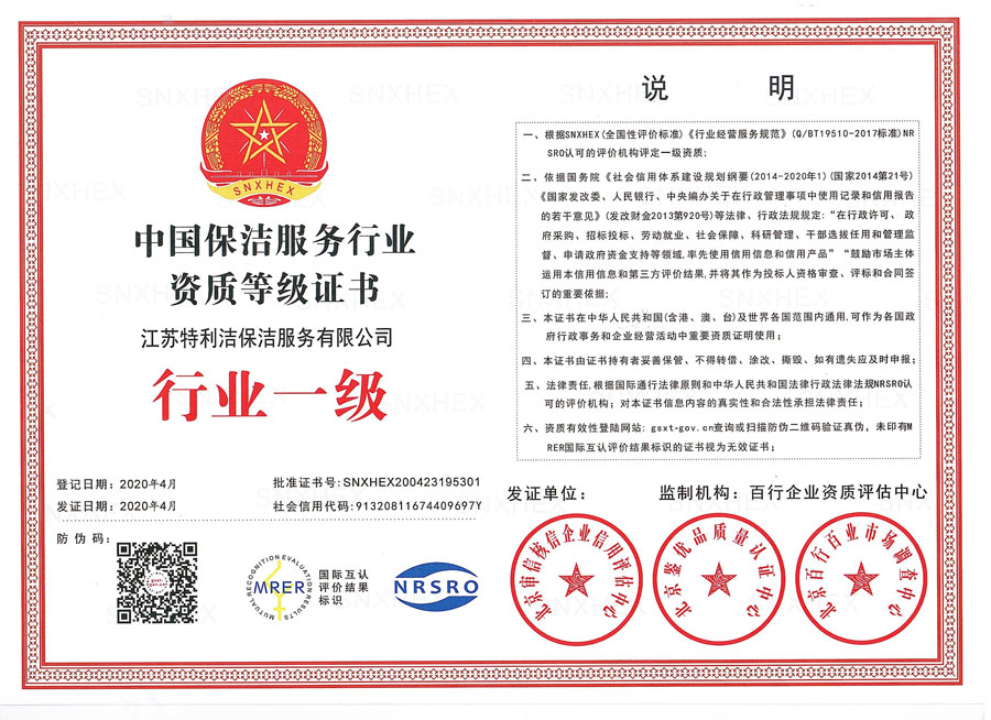 江蘇特利潔保潔服務有限公司(前稱為淮安市特利潔保潔服務有限公司),成立于2003年,于2018年經工商變更登記為“江蘇特利潔保潔服務有限公司”,是經工商部門登記注冊的合法企業。公司員工經系統培訓后上崗,本公司全部采用特利潔專業清洗設備、藥劑,并秉承了特利潔先進的管理模式,具備了專業的清洗技術、服務和網絡優勢以及一批訓練有素的專業清潔隊伍及管理人員,致力于推動淮安清洗行業朝著規范化、專業化、標準化方向發展。公司成立至今,經過我們全體員工的不懈努力,以及本著“誠信、專業、周到”的服務使得接受過我們服務的每一位客戶均能成為我們的長期合作對象。公司也從起初十幾名員工的小公司逐漸發展壯大,現已初具規模,并在保潔行業當中占據一定份額。現與恒大集團等世界500強企業建立戰略合作。2018年10月公司取得三A信用評級、三A重合同守信用單位...